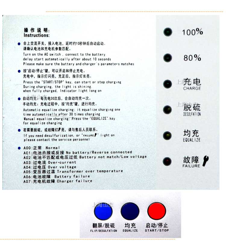 在正常充電中請勿超時按住翻屏/脫硫鍵,以免誤進初充硫化狀態(tài),造成電池的過充。脫硫為長時間充電,整個過程需要定時監(jiān)測電池充電狀態(tài),測量電壓與比重,避免過充。