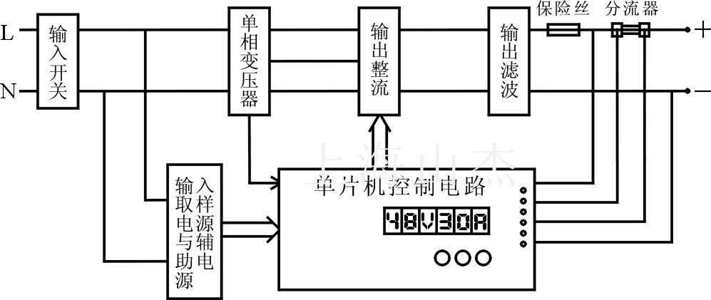 充電機的交流輸入電源通過輸入開關加在工頻變壓器初級,通過變壓器電磁耦合,將輸入高壓變成適合蓄電池充電的電壓等級,該電壓經(jīng)橋式半控整流橋變成脈動直流電壓。